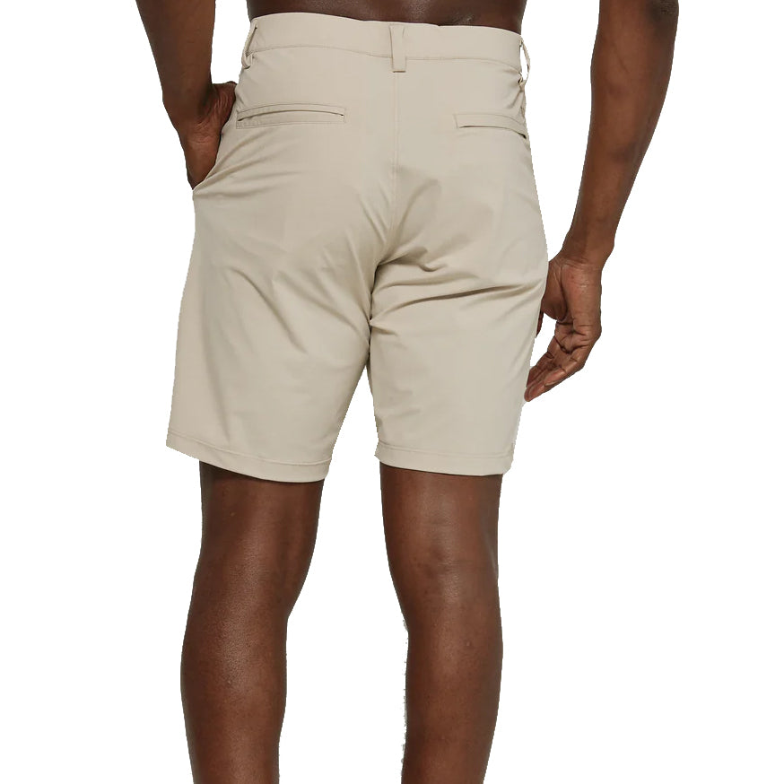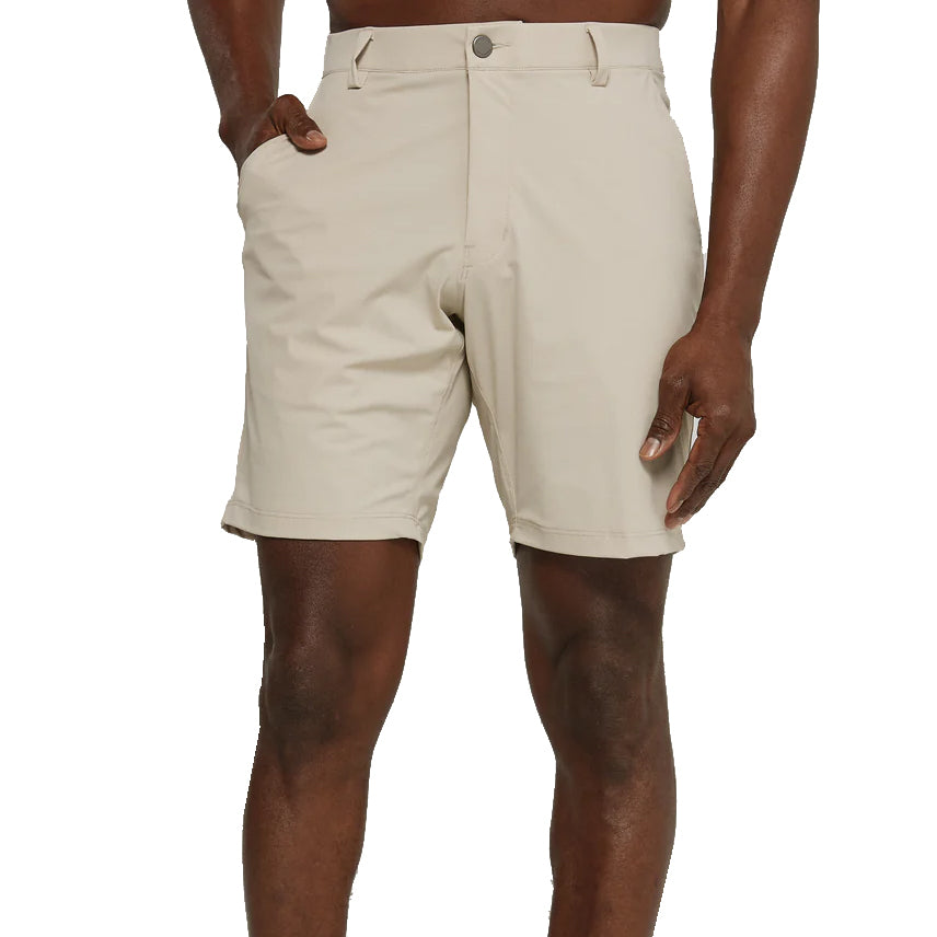 A premium 4-way stretch short that features a sleek silhouette and detailed stitching for a modern contemporary look. Equipped with elastic waistband and pockets for your valuables.