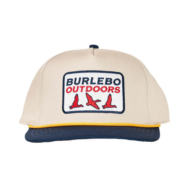 Classic meets rugged in The Outdoorsman Cap. A timeless staple built for everything from sunrise hikes to post hunt tailgates. Featuring a tan crown, navy bill, and a bold yellow rope across the front, this cap pairs traditional outdoor colors with standout details. The “BURLEBO Outdoors” patch front and center ties it all together, making it a go to for those who live life outside.