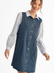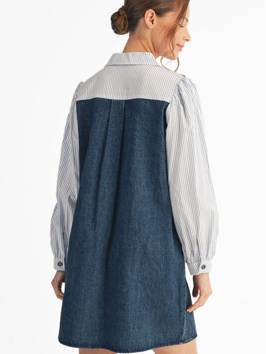 Long sleeves button down denim dress with side pockets, stripe contrast.