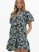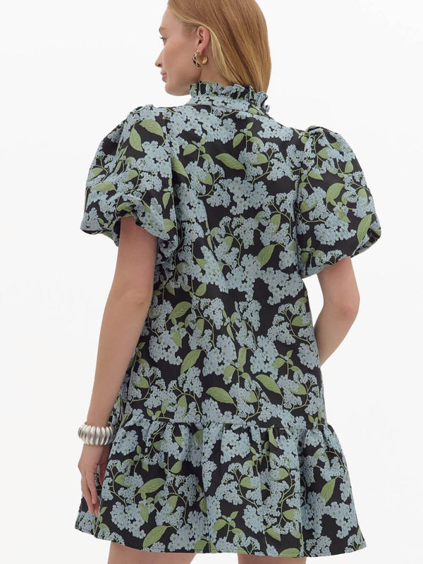 Botanical print short puff sleeve mini dress featuring ruffled neck band collar V-neck.