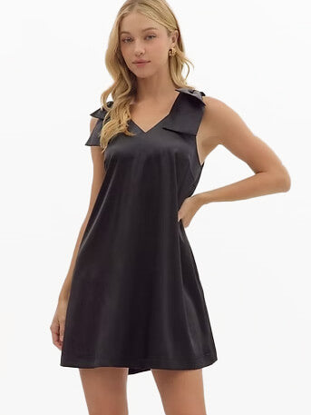 + Solid sleeveless mini dress featuring bow detail at shoulders and V-neck.