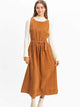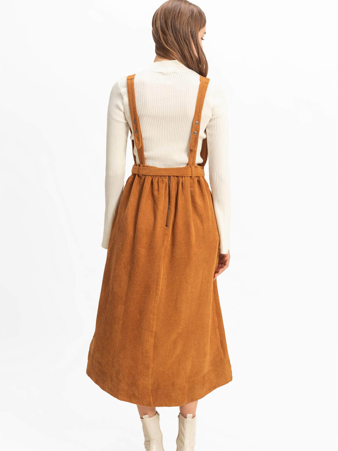 Embrace the unique texture of this sleeveless corduroy midi dress featuring a cinched waist enhanced by a matching fabric belt. The full, gathered skirt adds a touch of whimsy for a balanced silhouette. Perfect for transitioning seasons, pair this piece with a fitted blazer and ankle boots for an autumnal look.