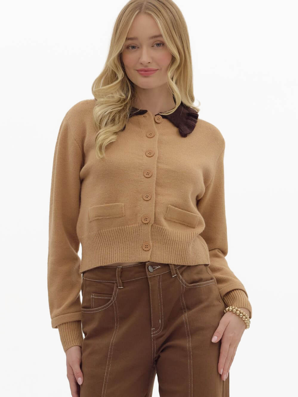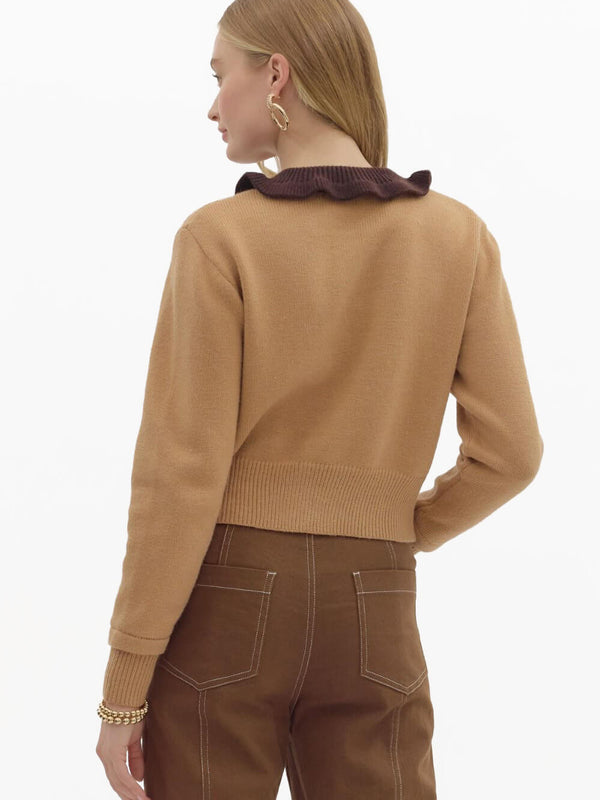 Solid twofer long sleeve cardigan featuring contrast ruffle edge collar button front closure. Unlined. Knit. Non-sheer. Lightweight.