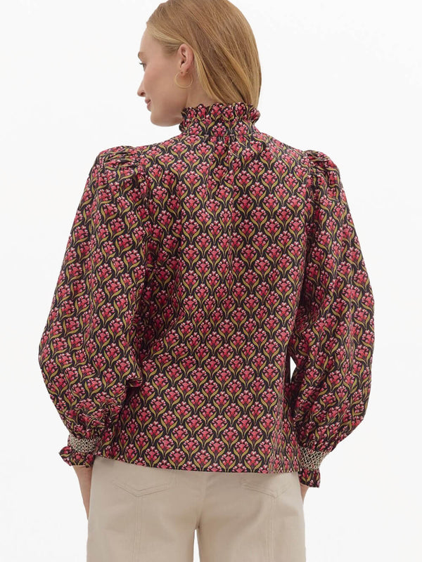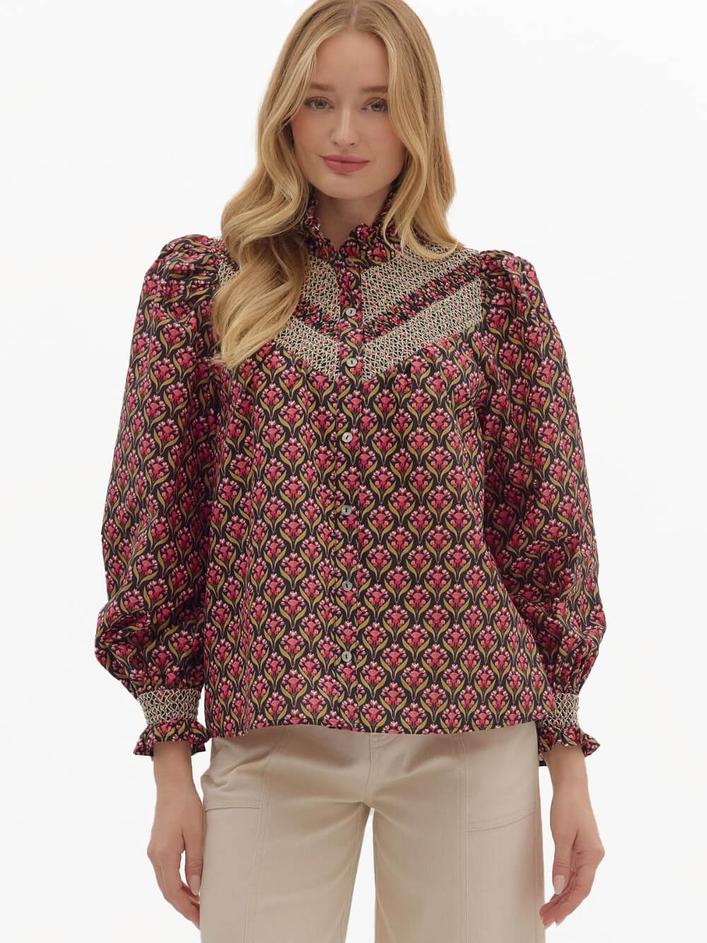 Floral print long sleeve button-up top featuring smocked yoke and ruffled stand collar. Smocked cuffs. Unlined. Woven. Non-sheer. Lightweight.