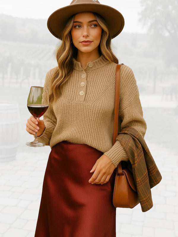 Brighten up your wardrobe with the Golden Glow Sweater, a cozy-chic piece that blends comfort with effortless style. Crafted in a soft golden yellow knit, this sweater features a relaxed fit with dropped shoulders, long sleeves, and a ribbed hem for a laid-back silhouette. The henley-style neckline with four functional buttons adds a touch of detail, making it perfect for layering or wearing solo. Pair it with your favorite denim or skirts for a warm, stylish look that transitions seamlessly from day to night.