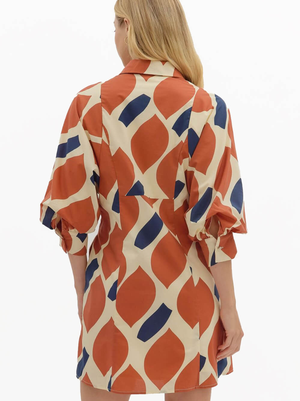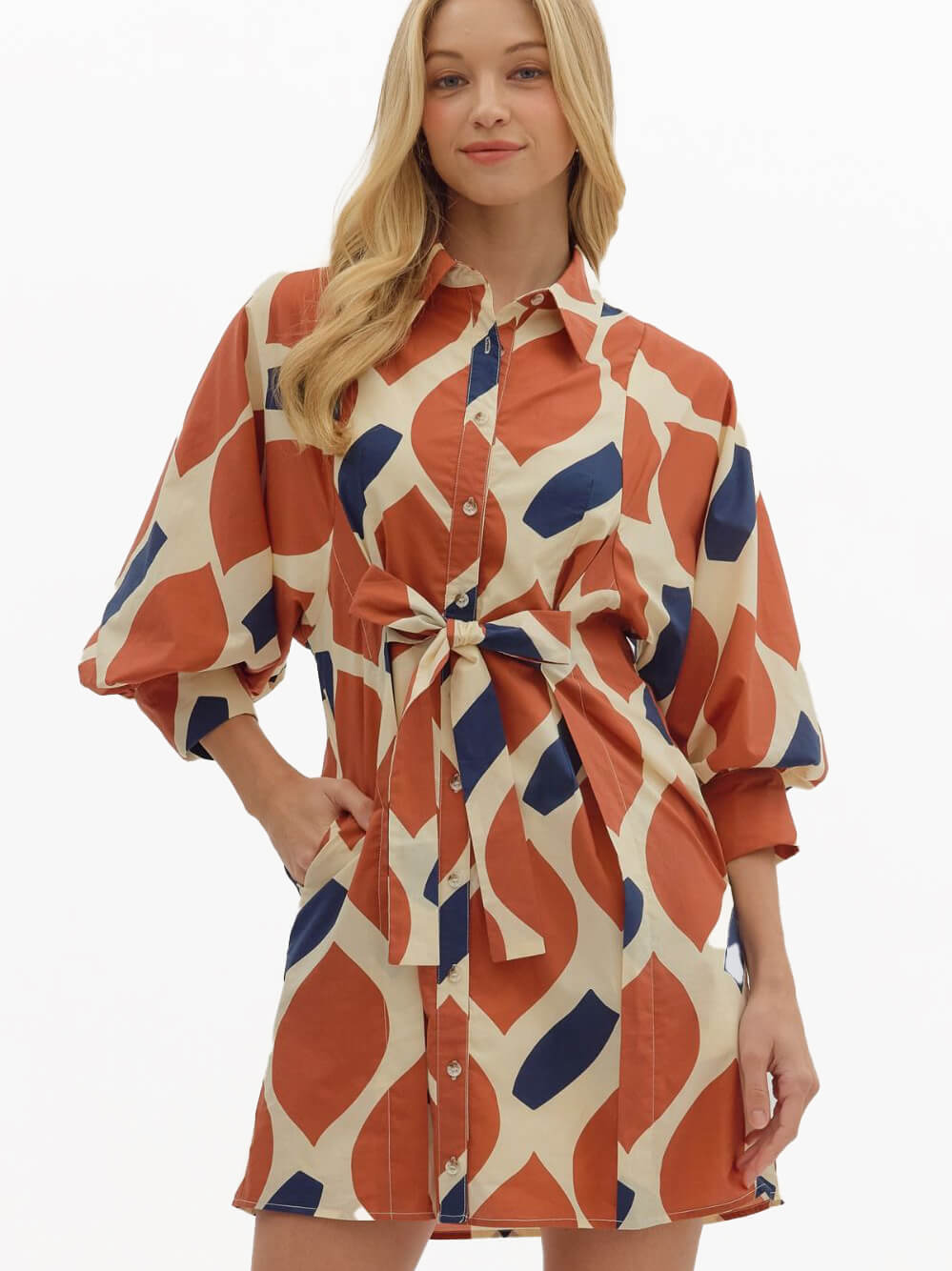 Printed 3/4 sleeve mini dress featuring self-tie waist. Shirt collar. Button closure at front. Side pockets. Lined. Woven. Non-sheer. Lightweight.