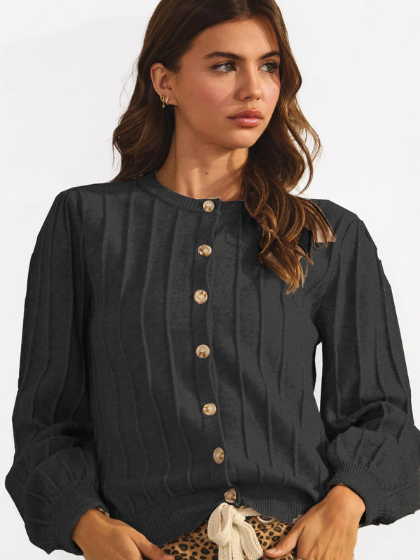 Crafted from a soft, ribbed knit fabric, this sweater offers a flattering fit with its subtle texture and classic silhouette. The button-down front adds a touch of sophistication, making it versatile for both casual outings and more polished looks. Whether layered over a tee or worn alone, the Lanie Sweater is perfect for layering during cooler months.
