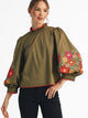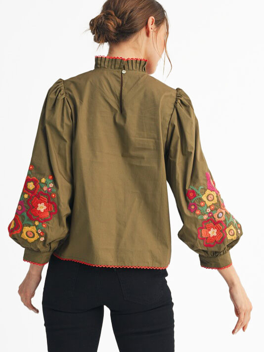 3/4 balloon sleeves top with embroidery, ruffled mock neck, lace trim edge detail.