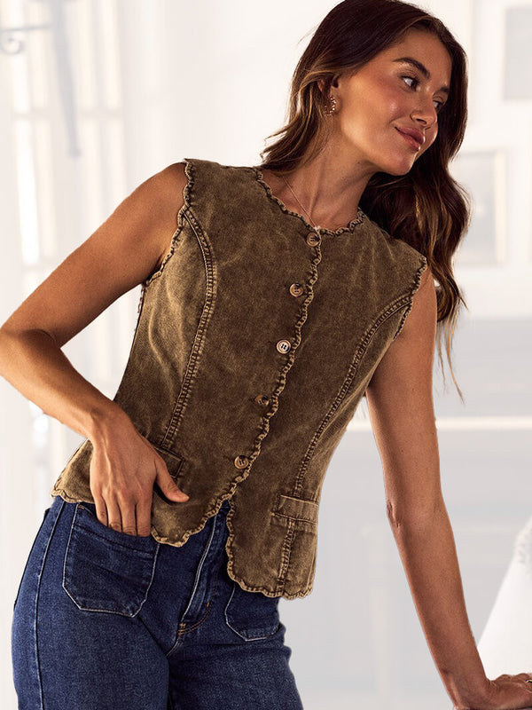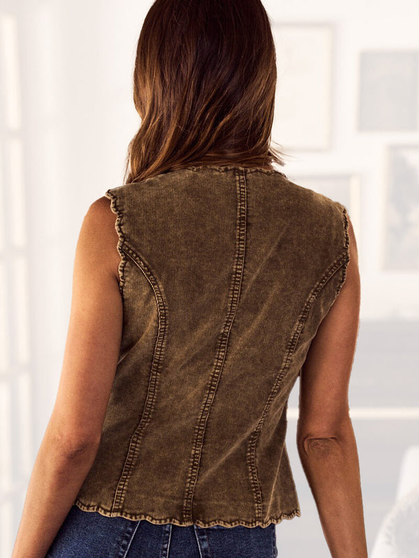 WASHED CORDUROY SCALLOP EDGE BUTTON FRONT VEST TOP.