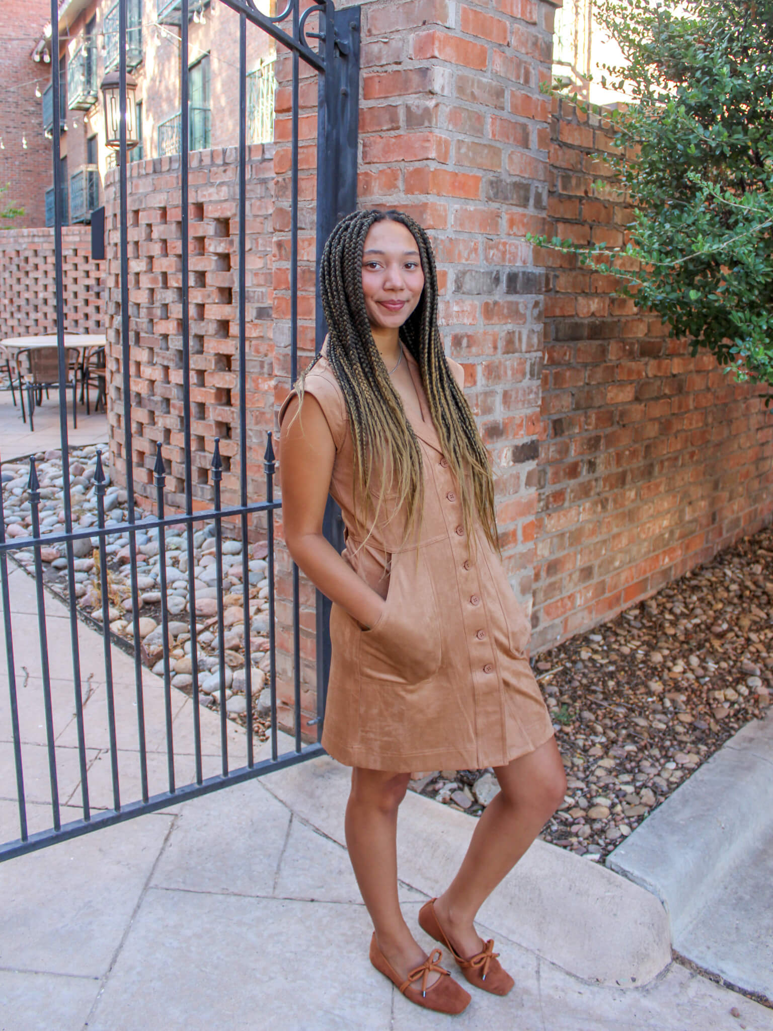Chic and modern, this sleeveless faux suede button-down mini dress offers effortless style with a touch of texture.