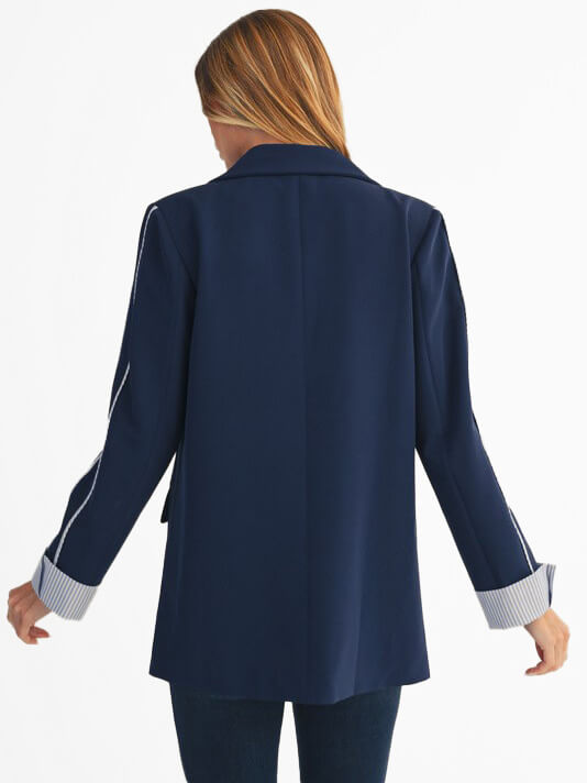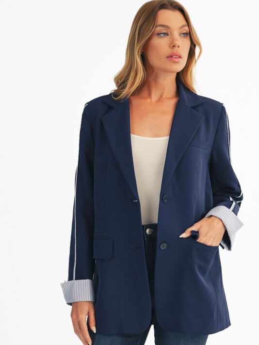 Long sleeves 2 buttoned solid blazer with stripe contrast accent.