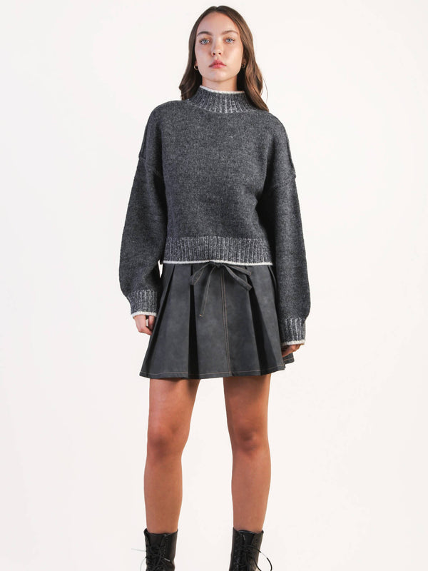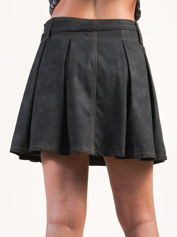 - Vegan Leather Pleated Mini Skirt W/ Shorts Inside - Waist Tie - Side Zipper