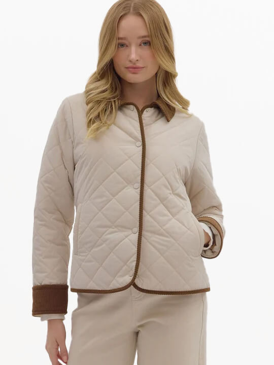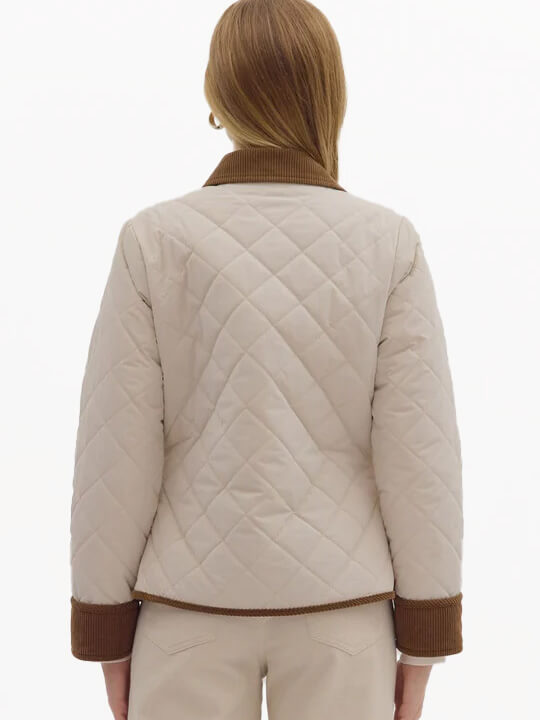Effortlessly chic and endlessly versatile, this quilted jacket is a cool-weather essential. Designed in a soft neutral tone, it features diamond stitching for a timeless touch and contrasting trim that adds subtle sophistication. The snap-front closure and cozy lining make it perfect for layering on crisp mornings or casual evenings out.