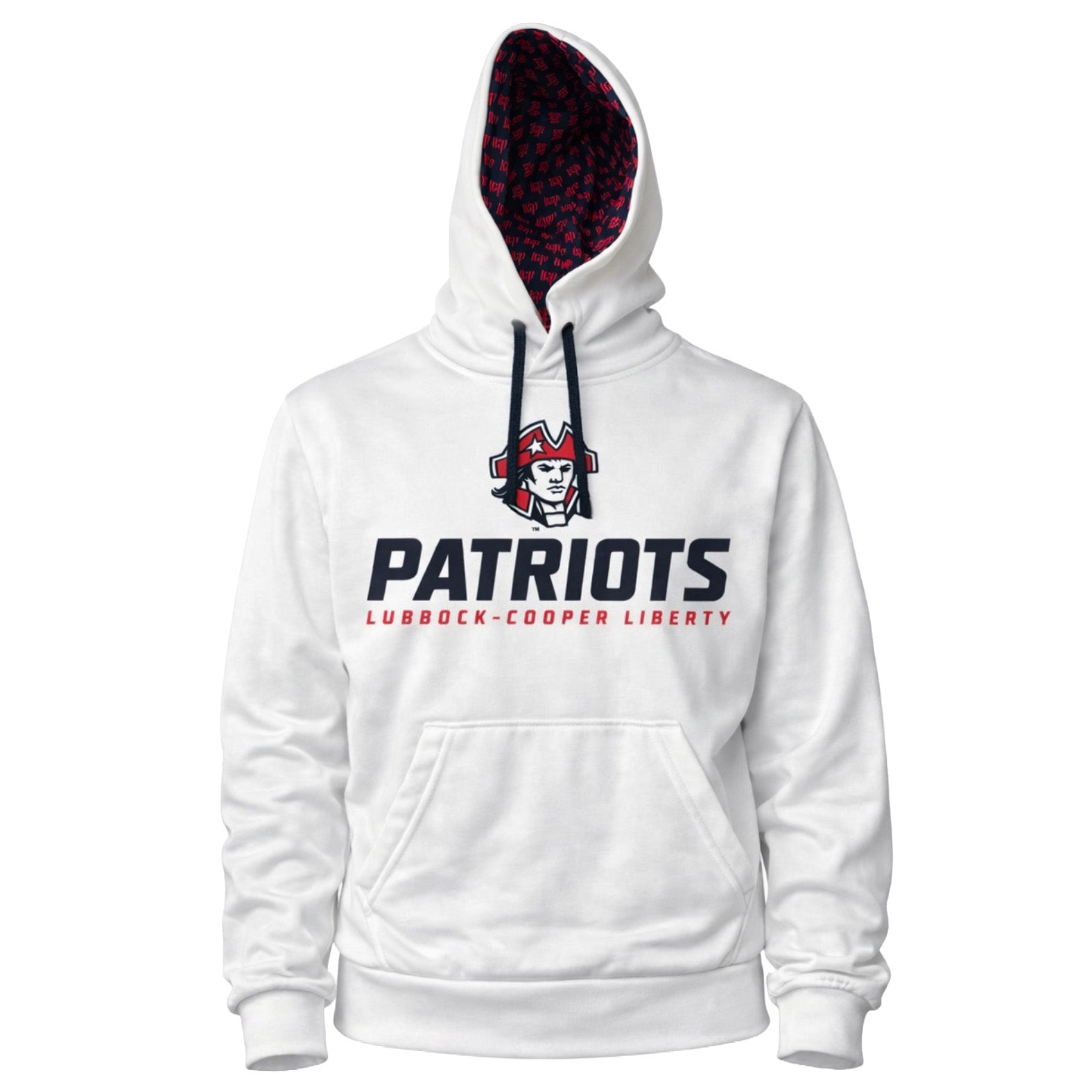 Show your school pride in standout style with the Lubbock–Cooper Liberty Patriots Hoodie. Designed for comfort and bold spirit, this pullover features a clean, modern front graphic with the Patriots logo and wordmark, paired with a striking allover logo print inside the hood for a premium touch.