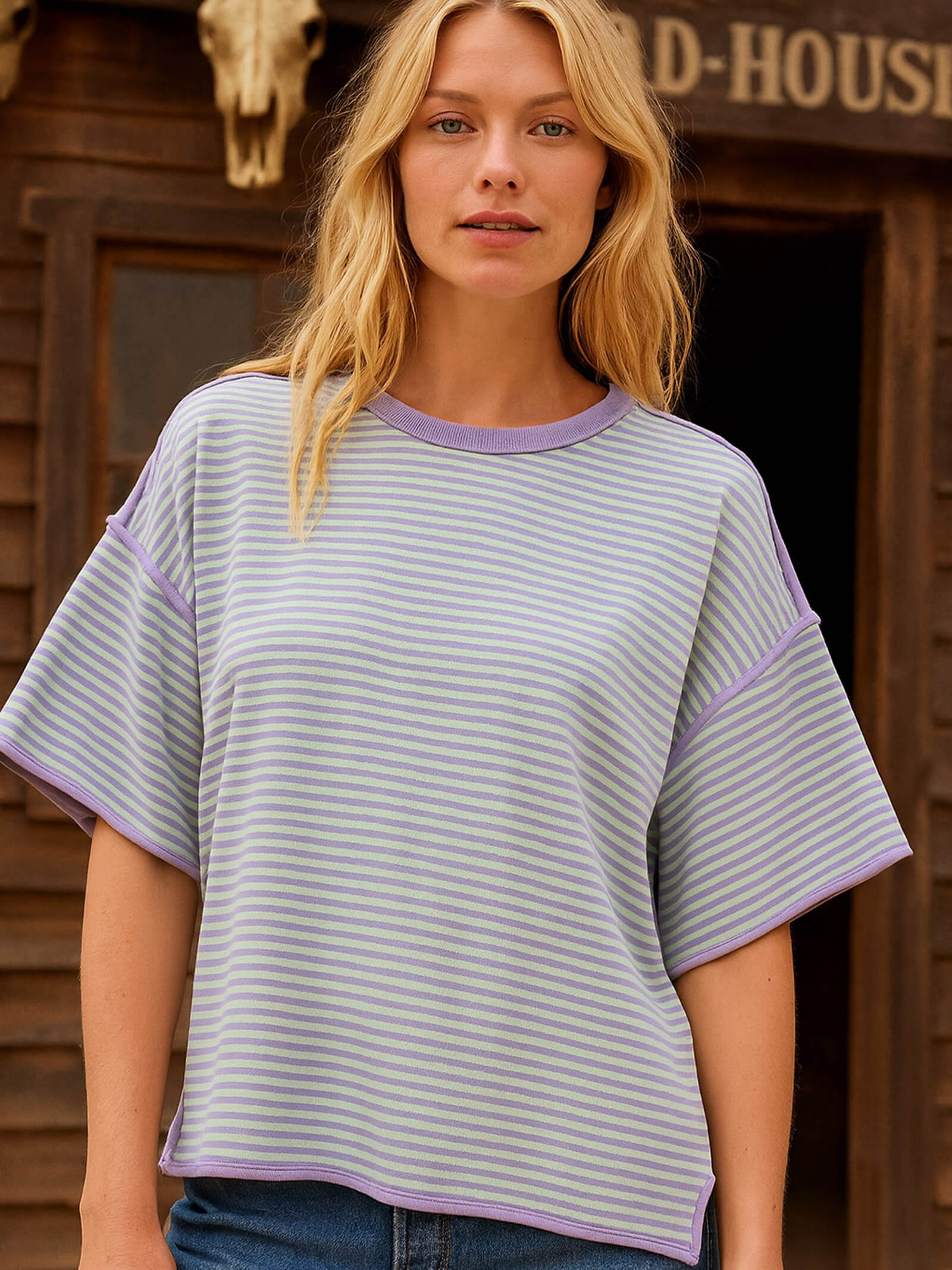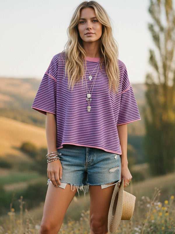 A relaxed and effortlessly chic striped knit top featuring a boxy oversized fit and drop shoulder sleeves for a laid-back, boho look.