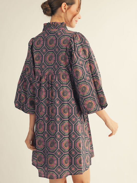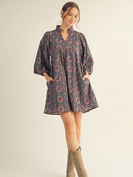 3/4 puff sleeves boho print babydoll dress with side pockets, ruffled high neckline.