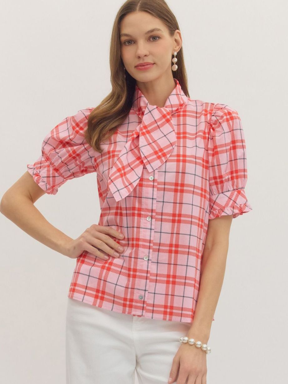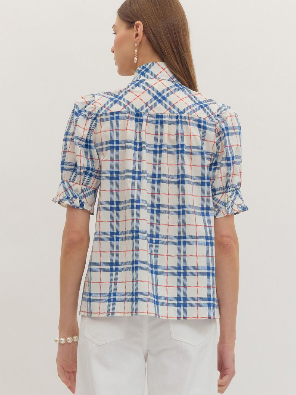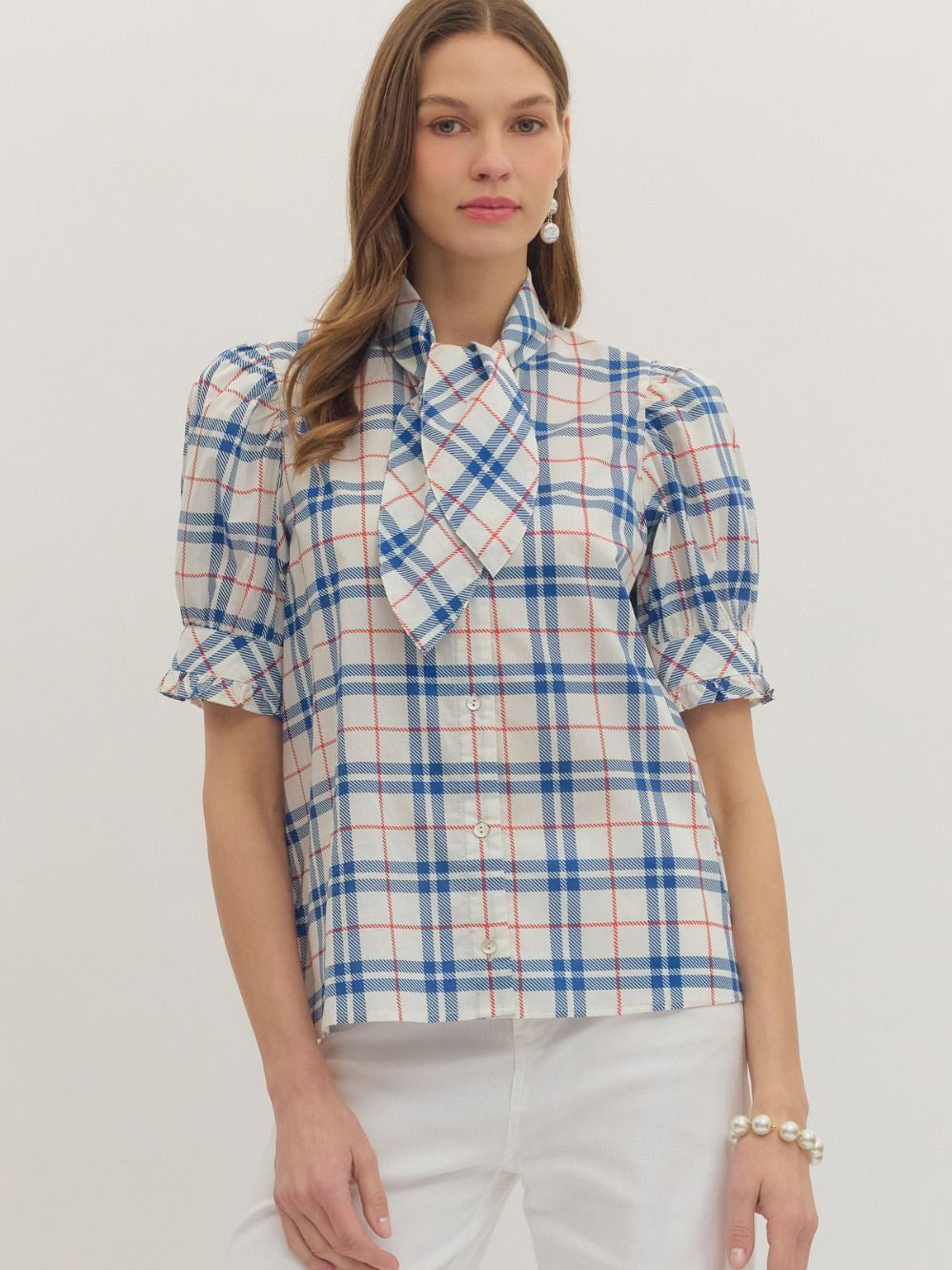 Plaid print tie neck short puff sleeve top featuring layered neck tie detail.