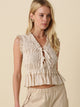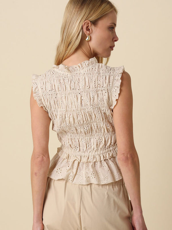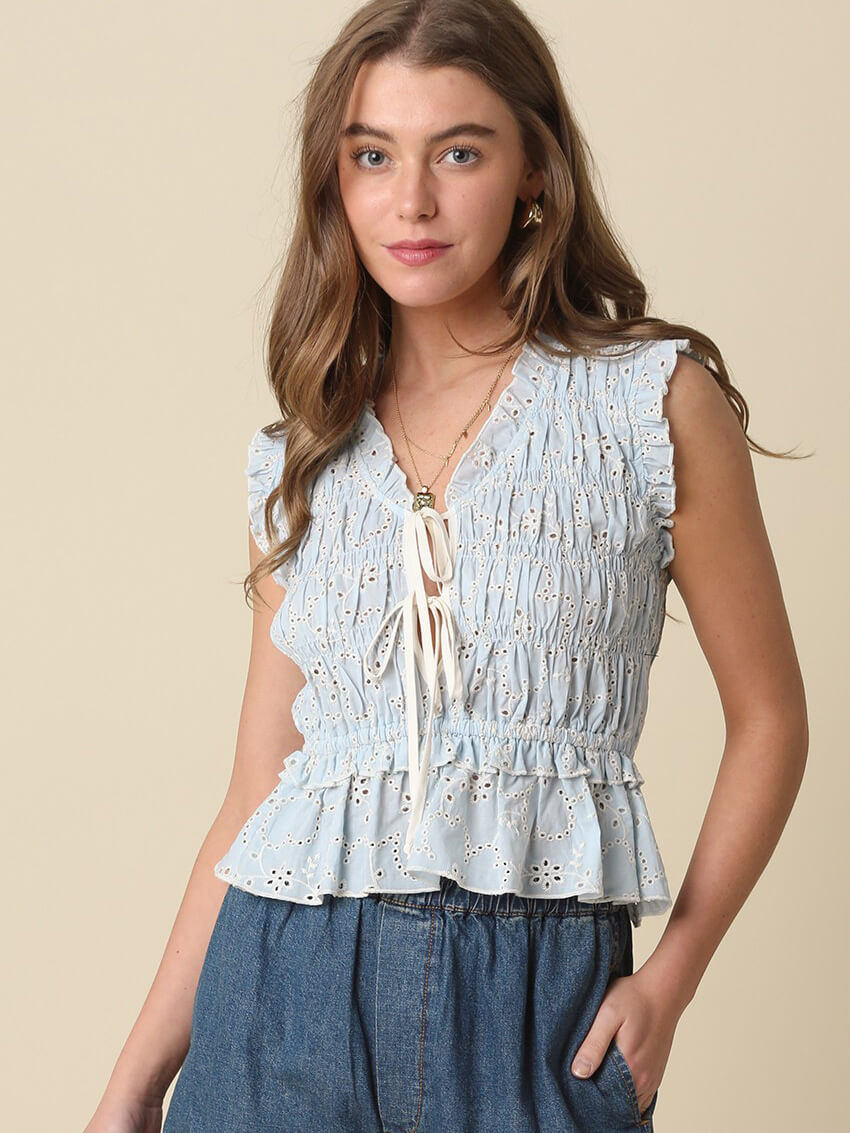 Smocked Ruffle Hem Blouse that features an all over smocked bodice with a softly flared peplum hem and a tie front neckline with delicate ruffle trim along the shoulders and armholes.