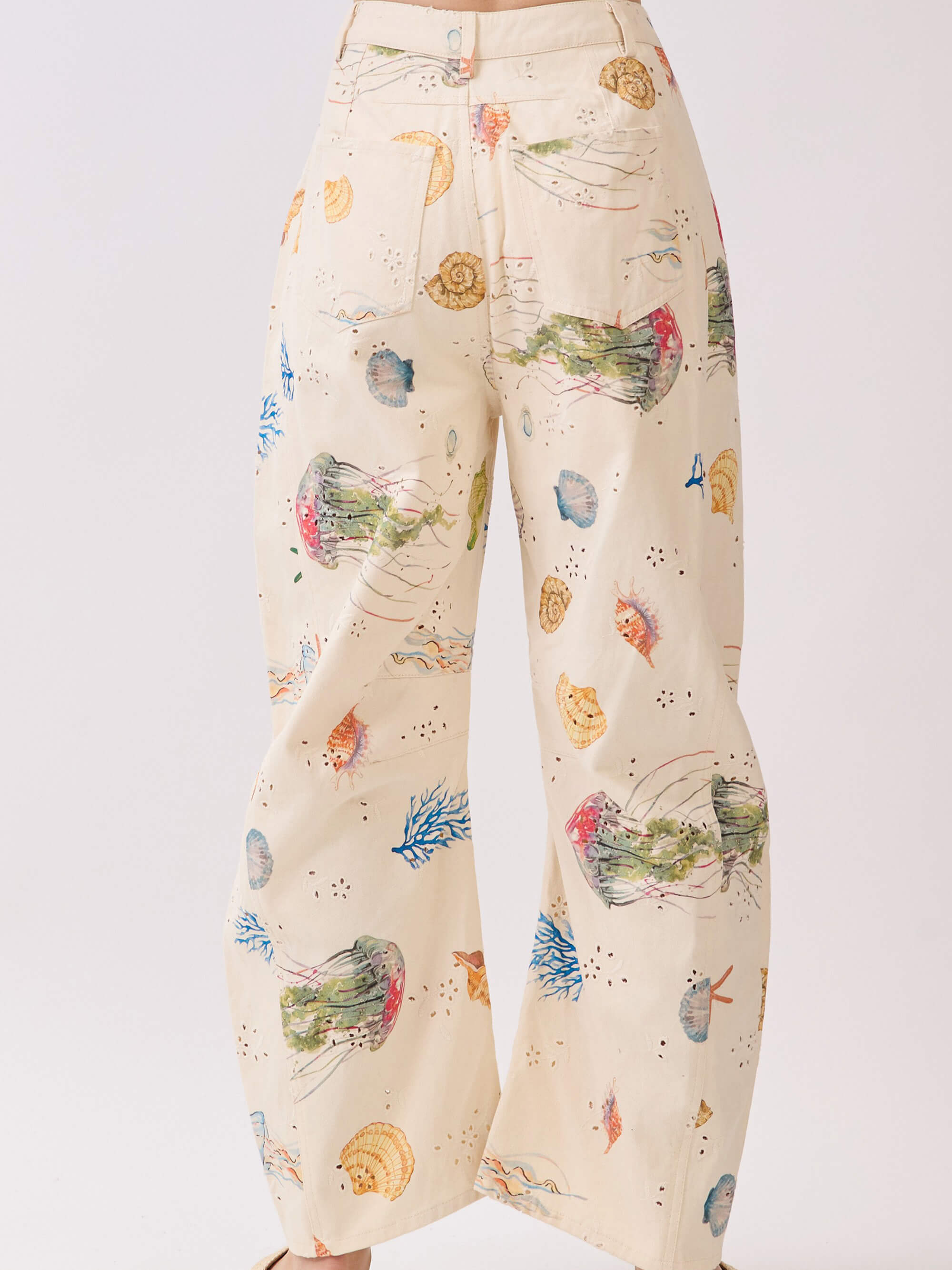 High-Waist Denim Barrel Pants with Eyelet Detailing and a Seaside Print.